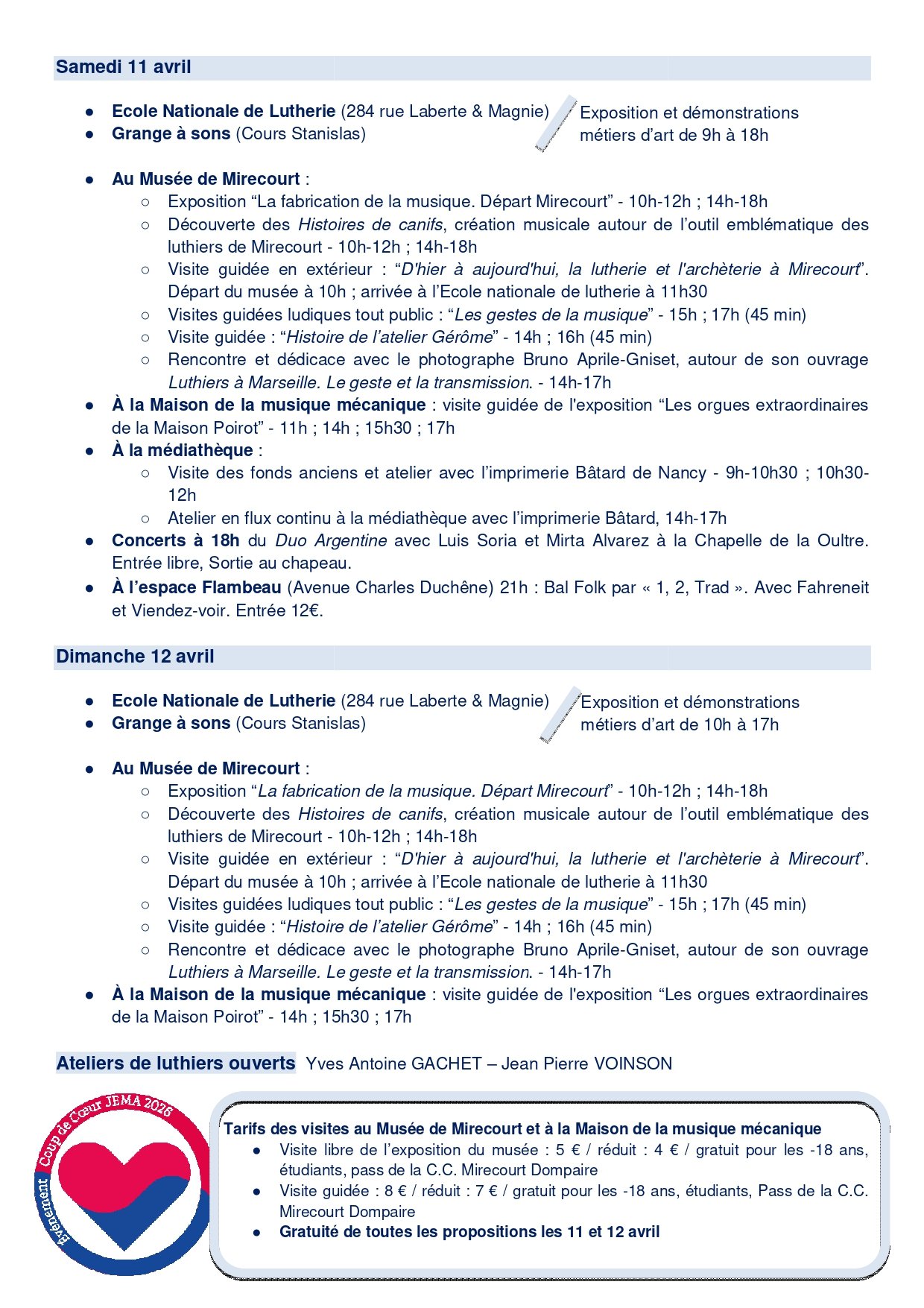 Thématique 2026 : Coeurs à l'ouvrageMirecourt rayonne à travers ses savoir-faire ! Pour les Journées européennes des métiers d'art sur la thématique « Coeurs à l'ouvrage », nous préparons un bel évènement : expositions et rencontres avec des artisans d'art (luthiers, archetiers, vanniers, dentellières, céramistes, créateurs textiles, sculpteurs, forgeron, …), projections, visites et balades guidées, stages d'initiation, ateliers de découverte pour les enfants, …