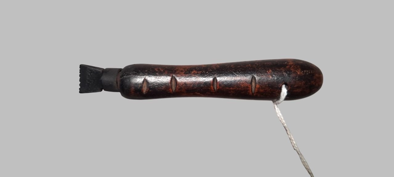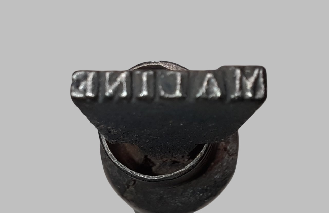 Descriptif : Fer à marquer en acier gravé « MALINE » et manche en bois, permettant d'apposer le nom de l'auteur sur un instrument ou archet. Le manche en bois est marqué de 4 entailles qui permettent de distinguer le sens de la marque à apposer.
