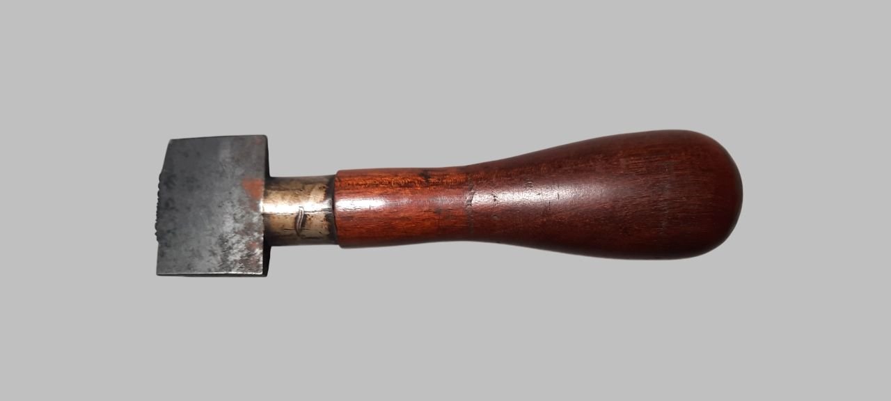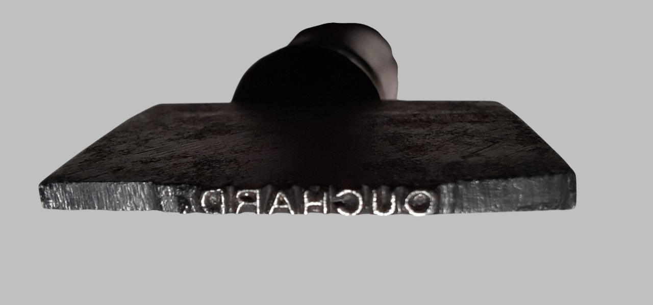 Descriptif : Fer à marquer en acier gravé « OUCHARD. » et manche en bois, permettant d'apposer le nom de l'auteur sur l'instrument qu'il a fabriqué.