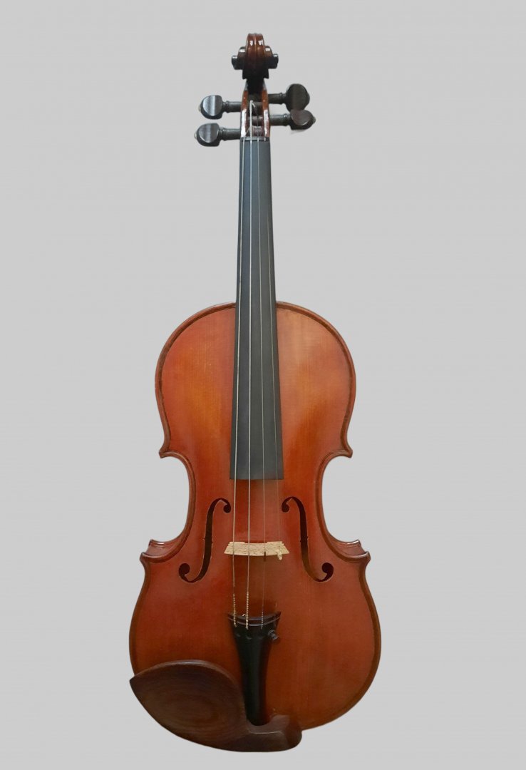 Descriptif : Violon entier. La table est en deux parties, en épicéa à pores moyens et réguliers. Le fond est en une pièce, en érable très maillé et à ondes fines à moyennes, régulières et descendantes de gauche à droite. Un filet à trois brins (ébène-érable-ébène) est incrusté sur le bord du fond et de la table. Deux petites chevilles sont incrustées sur le fond, au centre et en haut sous le talon et en bas au centre au-dessus du filet. Les éclisses sont en érable, également maillé et à ondes fines à moyennes. Le joint central du bas comporte un filet à trois brins (ébène-érable-ébène). Le manche et la tête sont également en érable, à ondes plus fines et régulières que celles du fond et des éclisses. La tête est réalisée avec une enture, d'origine.